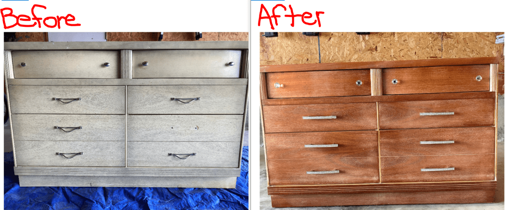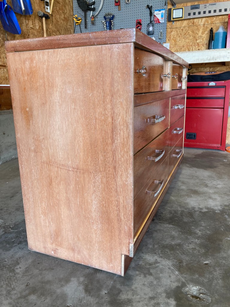 Right off the bat I want to point out a few things I have learned while refinishing my wood dresser. The very first thing you need to know is that stripping the old layer of paint or stain off is NOT as easy as this Tik Tok portrays, or if it is, I certainly have done things very, very wrong. I also used the CitriStrip, as seen in the Tik Tok, but in my experience, it took a lot more effort than just running the tool up, removing the layer as you moved along.