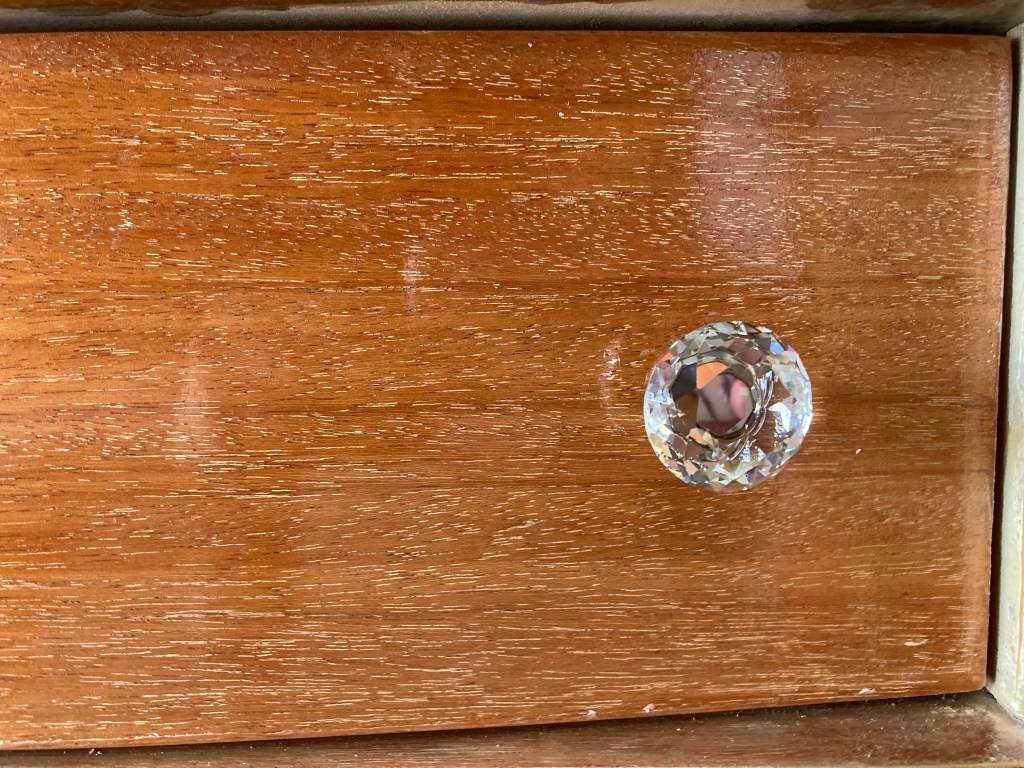 I also made about 9 trips to Home Depot to purchase the new hard ware, an anticipated exciting part of the process but it was so frustrating! My 13-year old daughter claimed this dresser very early in the process even though she does not need it. This complicates placing it in her bedroom because it is a different style than her current dresser and, as it turns out, there are several different styles of dressers! That aside, she wanted to choose the hardware (you are in for a treat!) so she found the most bling possible. So I bought it and attempted to screw it on but my old dresser’s wood must be thinner than modern dressers because the screws were too loose. So trip #2 back to Home Depot to buy washers to act as a filler, otherwise the hardware knob would just spin around. Okay, problem fixed. But then I bought too many knobs and not enough pulls. Trip #3 to return and exchange and luckily Home Depot has an excellent return policy. Next, I attempt to attach the pulls but they are too long, they don’t fit! Are you kidding!? I did not know these were measured, I had assumed they were a standard measurement, but NOPE! Now I am nervous because my dresser is very old and I am concerned that my required size is no longer available (and I still need the 13-year old’s ‘bling’!). Trip #4 I discovered that there are many sizes actually available! Who knew! And they had the bling hardware, in the size we needed. So, okay, 9 trips was an exaggeration but 4 did seem a little excessive to buy what I thought was a simple (but oh so surprisingly expensive) step of refinishing! All said and done, the dresser has (very blingy!) knobs and pulls on it.