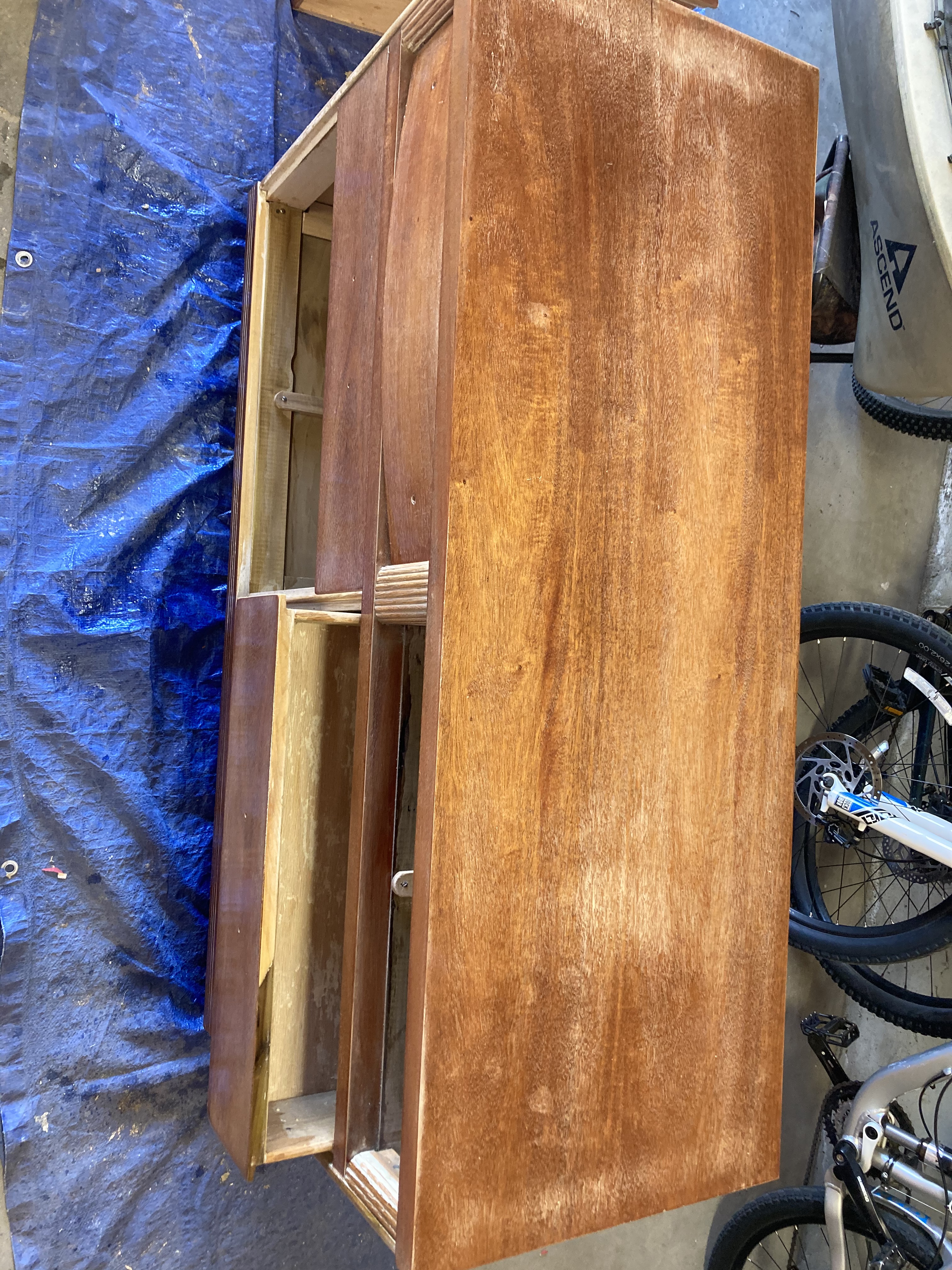 Stain. What is stain and how is it different from Tung oil? Well, wood stain is meant to enhance the colour of the wood enabling the natural wood grain to be visible. Stain is technically tinted, therefore the process is similar to painting. Therefore, stain actually changes the colour of the wood, unlike Tung oil. I am not sure what to think of this. Do I like the colour of the dresser? Here is a close up picture: