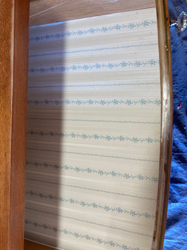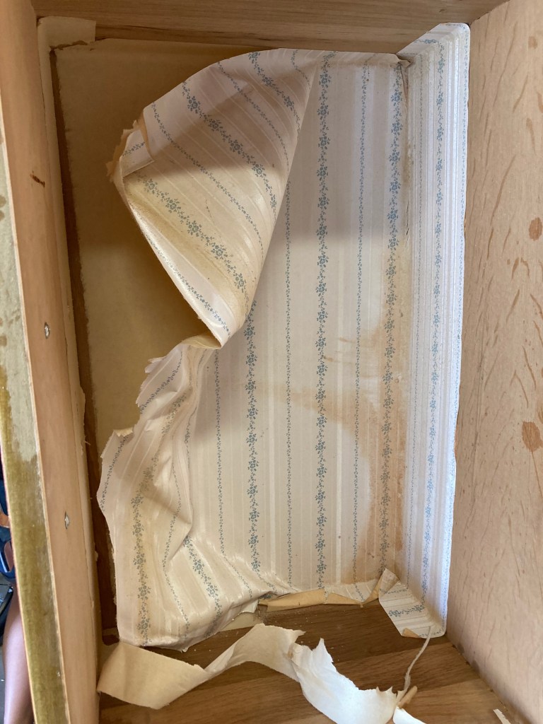 This dresser has six drawers and the drawers are each lined with wallpaper. I hate this! So I decided to remove it. Possibly a bad idea based on the effort it takes to remove!
