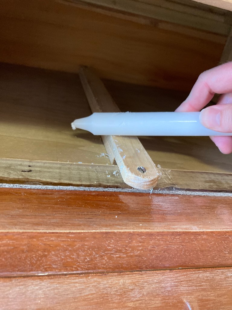 The next thing I did was wax the drawers because they were sticky and they did not slide nicely. I had only been told about this, I had no idea how to actually do it. I thought I had to melt the wax and somehow work with warm wax. Turns out, this was the easiest part of the entire project and this website was very helpful in educating me on this process.
