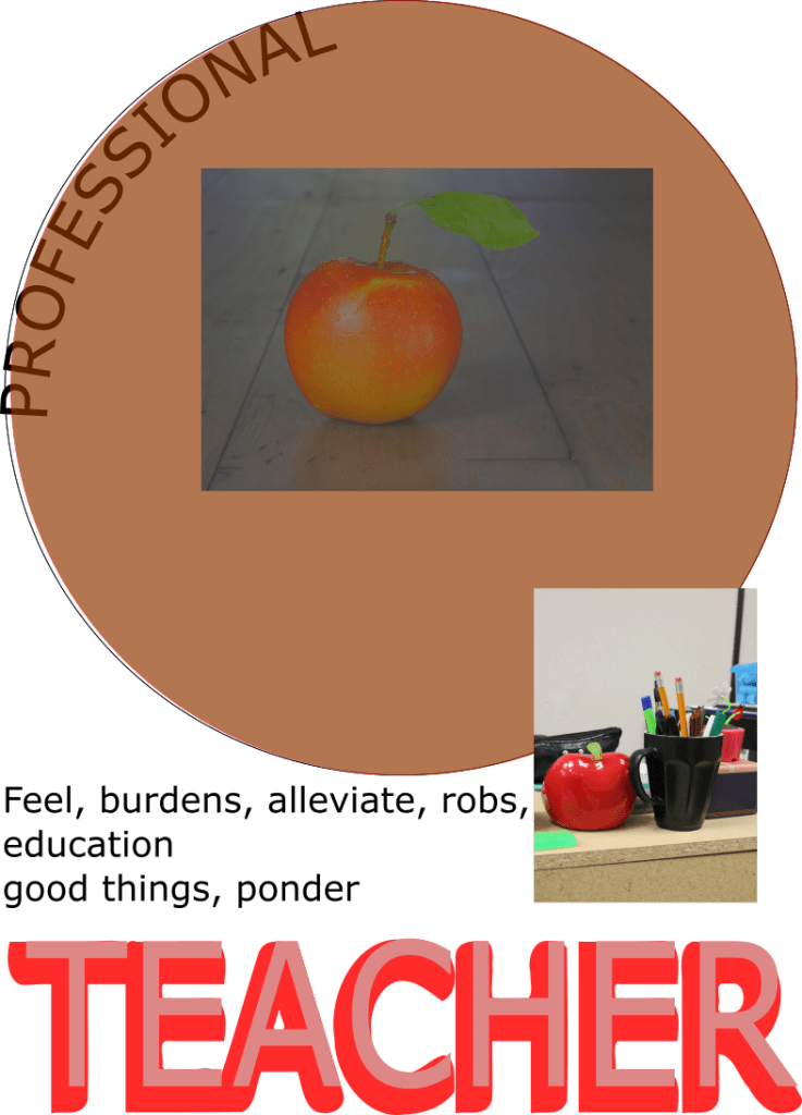The above poster is to bring awareness about the difficult yet rewarding career teachers enjoy. I wanted to express myself by exploring a new art form to me and InkScape (an online open source tool) is brand new to me. This simple poster took several hours to learn to make. Figuring out how to place the word “professional” in the circle was more effort than I expected. This was very symbolic to me because becoming and being a teacher is EFFORT, more effort than I expected. I used the word professional in the circle because as I think back to the teachers I have had in my life, they have always behaved professional: they never complained about the extra burdens they surely must have felt. Teachers no doubt wanted desperately to alleviate burdens their students experience as well. As Al was speaking, I thought of some students that do not get a fair chance at education and this led me to believe they are robbed of an education, a valuable asset I take for granted. As a teacher in training, I have many good things to ponder and think about. I needed to express this and I choose to do so through the creation of a poster that could include symbols, such as a circle that indicates learning and teaching have no end; and through the use of words. I appreciate that apples are round, further emphasizing that education has no end. The poster allowed me to explore art using words, symbols, poetry, images, and my creativity.