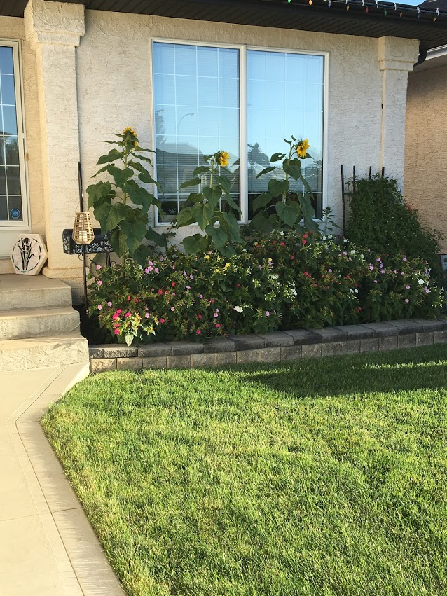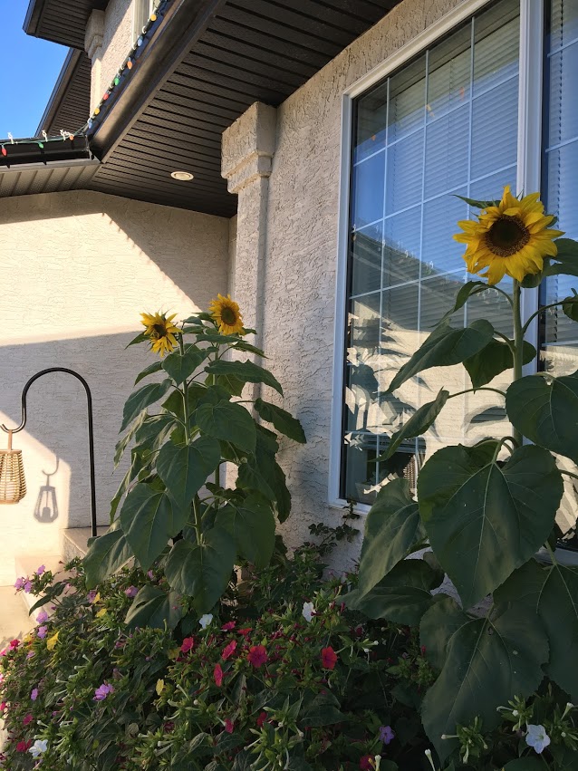 Every day, all year long I have pulled open my front blinds, in my home, first thing every morning. Today was no different except today I actually looked out my window and I saw the most amazing sight across the street in my neighbours front yard. She has planted the most beautiful little flower garden which includes these gorgeous sunflowers that are over six feet high now! I could not believe my eyes! As I ran outside immediately for a closer view my 11 year old daughter asked me what I was doing so I told her to look at the sunflowers and she responded: “What sunflowers?”! This is her bus stop, twice daily and she has never noticed them either! It made me really pause, think and ponder what other beauty I have missed this past summer due to my “busyness”.