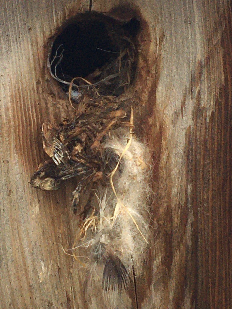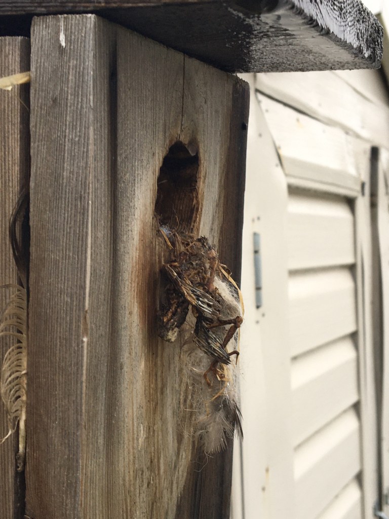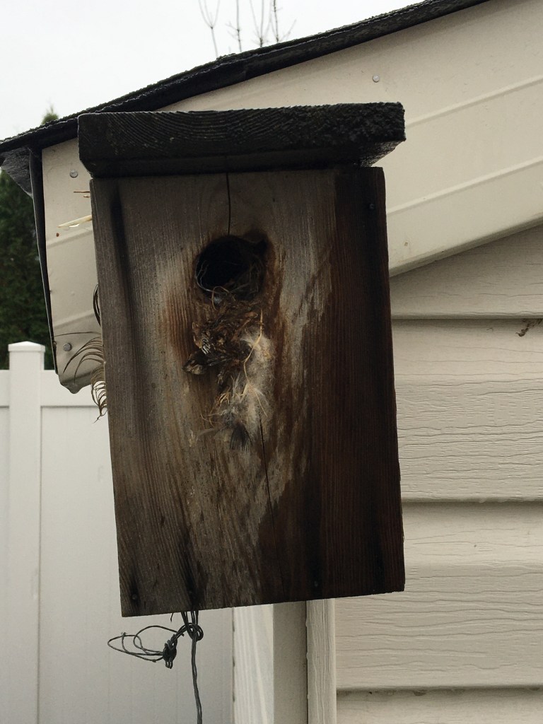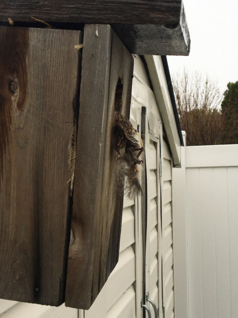 As I was washing dishes I looked out my window and noticed something odd about the wooden bird house my son had made in his Scouting group. There appeared to be something hanging out of the small hole and I wondered how long it would have been this way. At first I thought it was a bird stuck! The first picture above is the view from my kitchen window. The second picture is taken as I slowly approached the bird house. As I walked closer it still appeared as though there was a very small, brown bird stuck in the tiny opening of the rectangular wooden bird box. I did not hear anything though. I got up really close and this is what I saw: