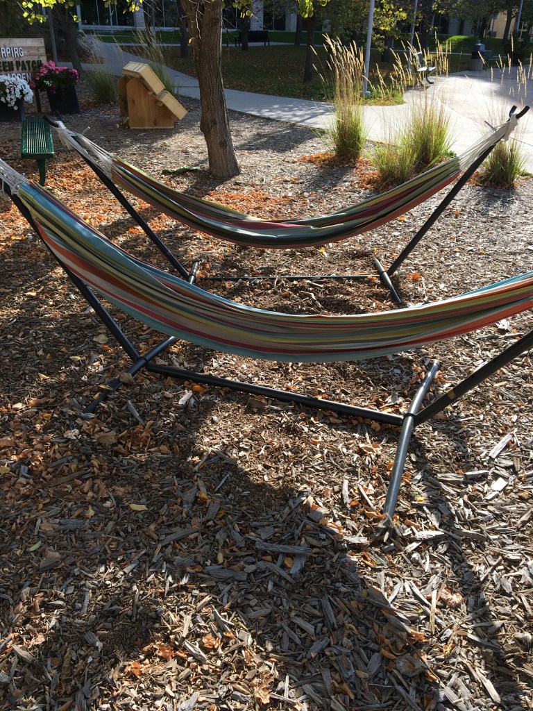 You will never guess what I discovered this week at the university! I was walking around the Green Space this morning (about 10:30), which is in the middle, inner courtyard of all the university buildings. I have around walked this space many times over the past few years. What caught my eye as I walked from the Ad Hum building to the Education building today (Tuesday, October 1) was the hammocks in the Green Patch. The Green Patch is an adorable and relaxing gardening area but I have never noticed these beautiful hammocks. I wish it was not so cold today because I want to spread it out, curl inside and let gravity and the breeze sway me back and forth. I am sure it will lull me to sleep for a few moments! What really caught my attention though was the fact that it is October and the hammocks are still there! Are they not put away for the winter? Or is there an optimist still out there!?