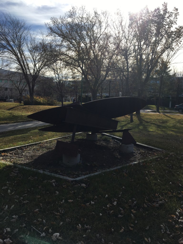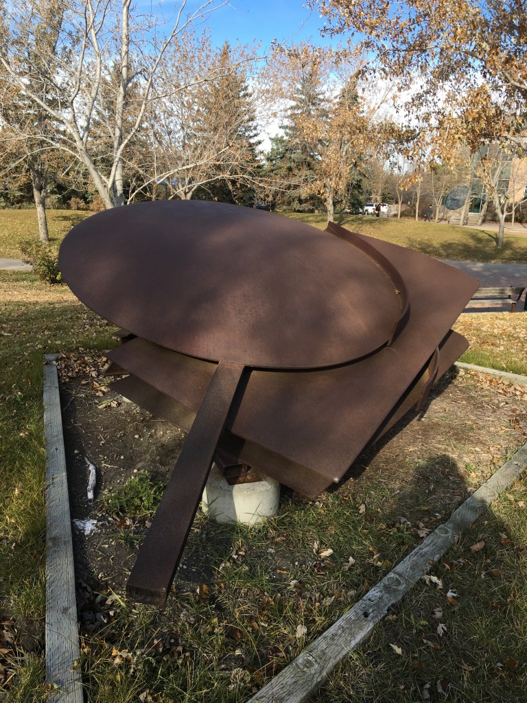 Pictured below are different angles of the art piece. To me it looks like a space ship, laying down. It is on an angled position with the smallest part, the ‘V’ shape making contact with the earth. This was very interesting to me because in class we have been learning about lines in art. The ‘V’ lines drive my eyes to the point at the end, where the art meets the earth. Then I follow the lines to up to explore the circle shape between the ‘V’ that lays on a flat surface supported by another line springing out of the ground. The bronze color was unique because it flows well with Saskatchewan’s farmland environment. Even though I do not find the color appealing I feel it fits our robust landscape. Thank you University of Regina for displaying such unique art work by local artists (John Nugent moved to Lumsden in 1945 where he established his own bronze casting foundry).