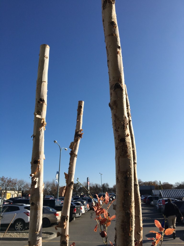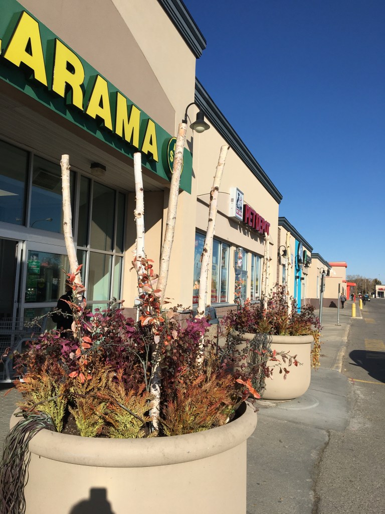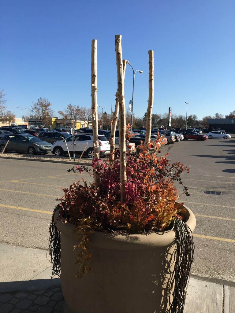 This caught my attention because the plants are at the end of their season but the tree branches are still reaching high, full of life. Perhaps these branches get decorated for the different seasons: I have never noticed this before so I am excited to see if Christmas ornaments will decorate this space beginning next month. I think this is such a pretty and unique welcoming to the Independent Store but I have never noticed how much detail is in the planters and I have been using this store at least twice per month for several years now! The tree branches seem to be between 2-3 inches in diameter, so a very solid width. I think this space could have added beauty by nestling a real pumpkin at the base of the tree branches in the soil!