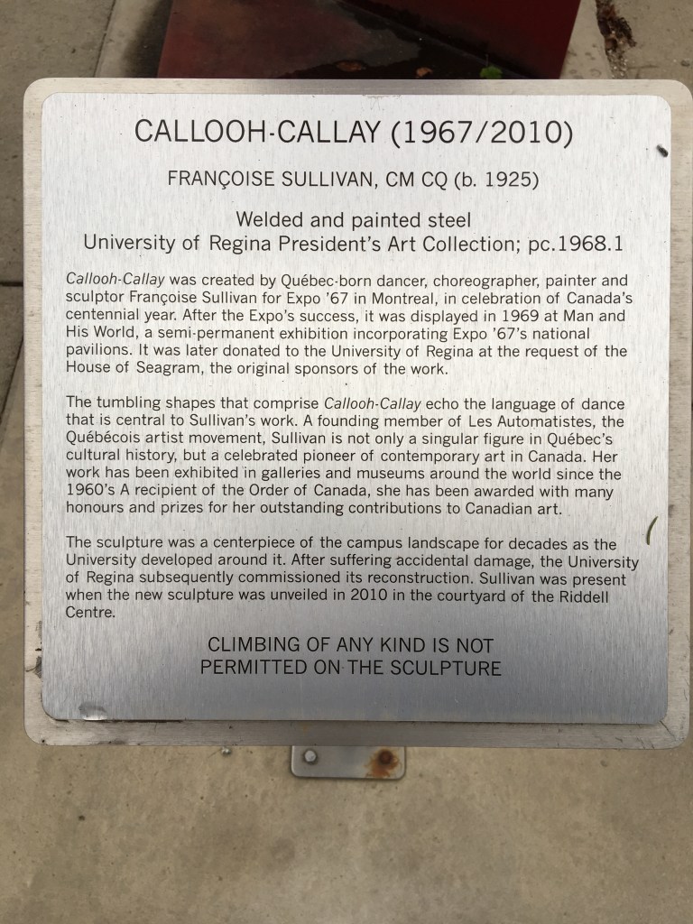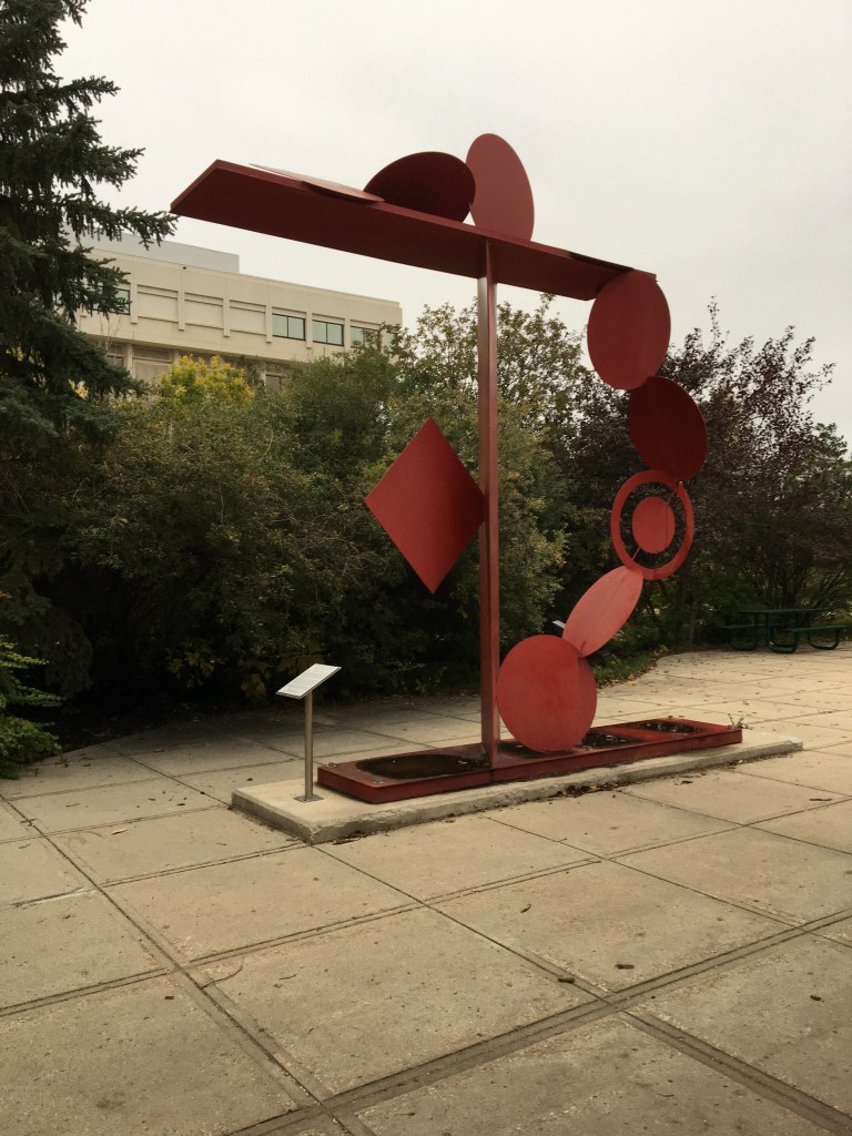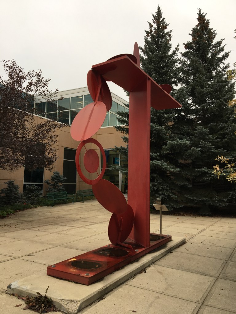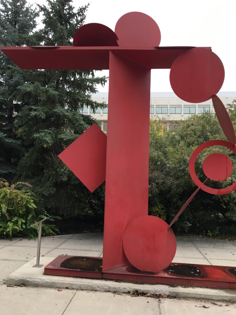 Monday, October 7th, 2019 I walked my regular route to the Education building from Riddell Centre at the University of Regina. I could not believe I saw this red steel art structure for my first time! I have been walking through the corridor connecting these 2 buildings several times per week for a few years now but this time I was paying attention to my surroundings. I looked out the window and this cool steel structure seemed to have popped right out of the ground! Look how cool it is! I took several pictures and I even tried to take a selfie to show how large this art structure is but I could not get myself and the entire art structure into the picture.