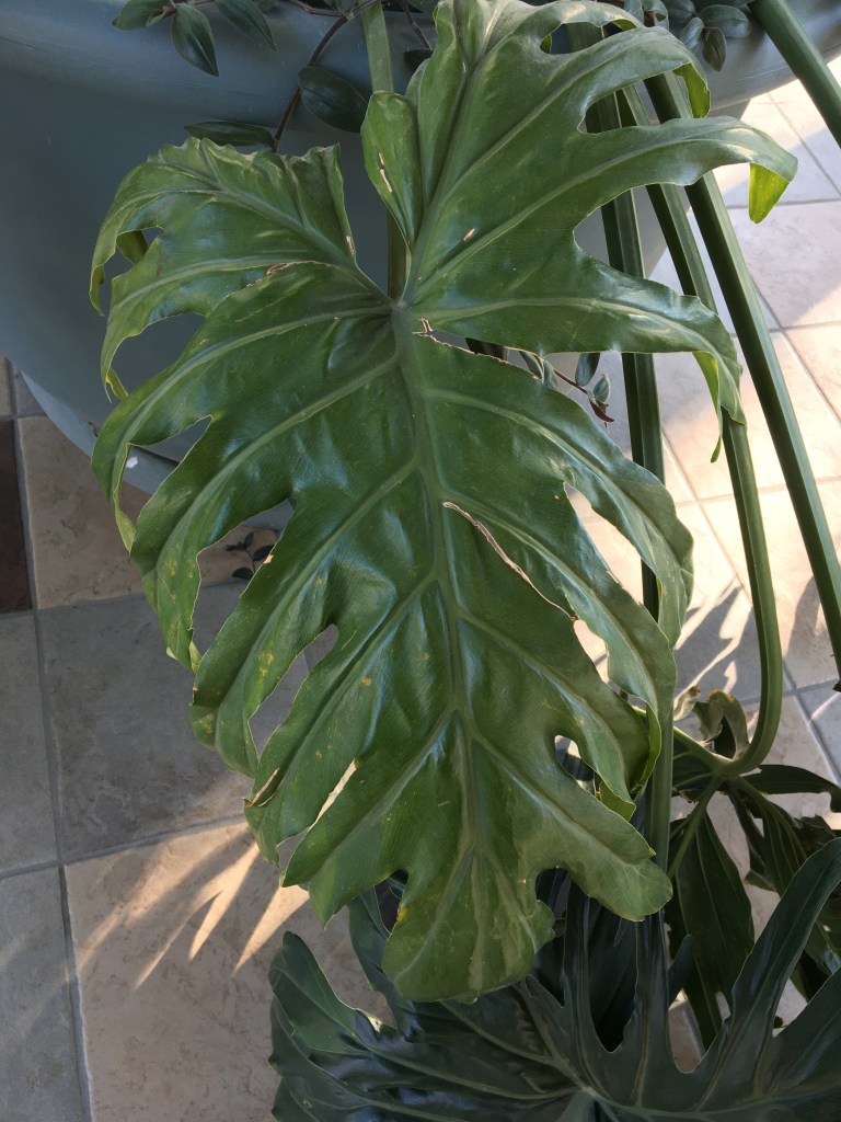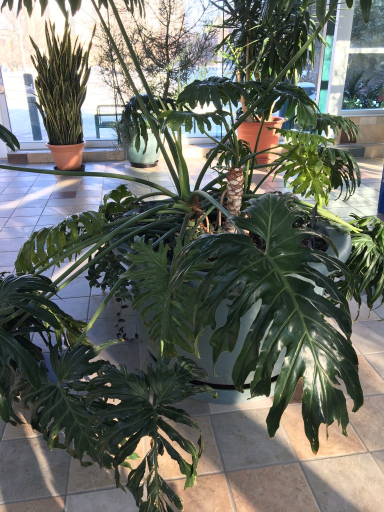 Every day, twice a day I walk from Riddell Centre to the Education Building at the University of Regina and today was no different. Connecting these buildings there is an absolutely beautiful atrium featuring a red piano, floor to ceiling windows and beautiful plants of all varieties. This time I stopped and looked at the leaves on one of the plants. This plant is so huge it’s impossible to miss but I have never noticed its leaves before. These leaves are very large and I was surprised that a plant like this can actually survive in our cold climate (even with the plants being indoor year round). Have a look at this beautiful plant and the close up picture to see the individual leaves. Also notice the unique looking stump in the middle of the pot that extends growth from it.